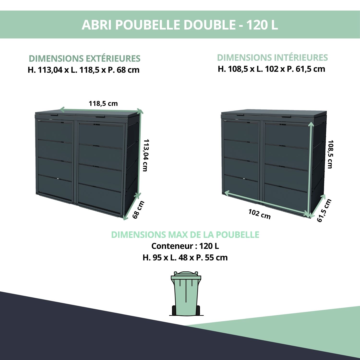 Cache poubelle extérieur double – Gris anthracite – 113 x 118,5 x 68 cm – 2 poubelles 120 L – Ref. MAC121GR-MACMC121GR