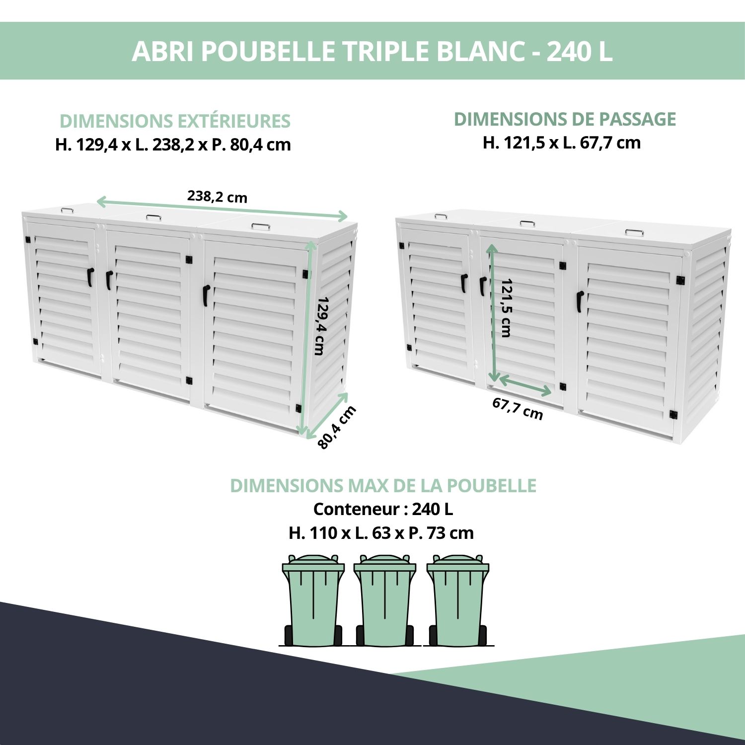 Abri poubelle triple – blanc- 129,4 x 238,2 x 80,4 cm – pour poubelles 240 L – Ref. MAC240BL-MACMC240BL-MACMC240BL