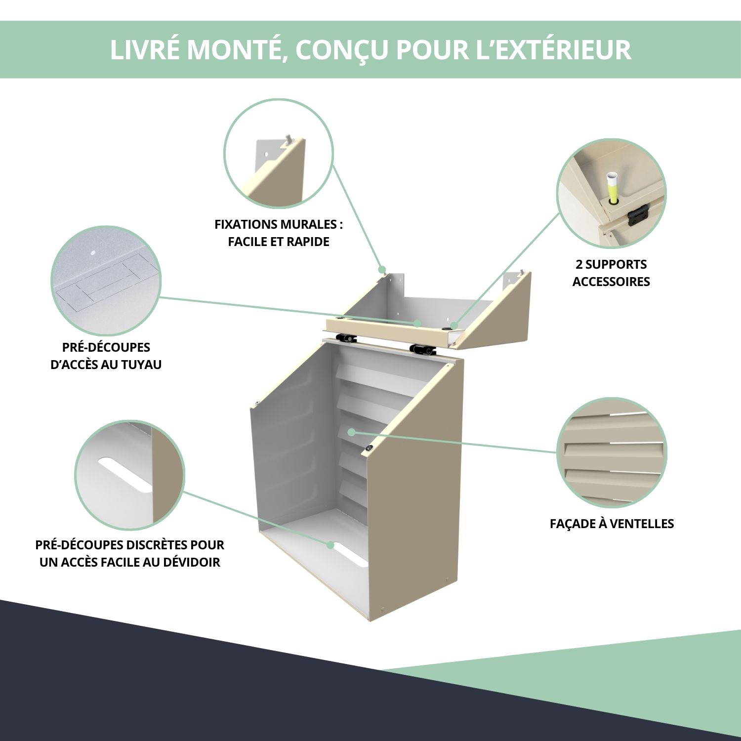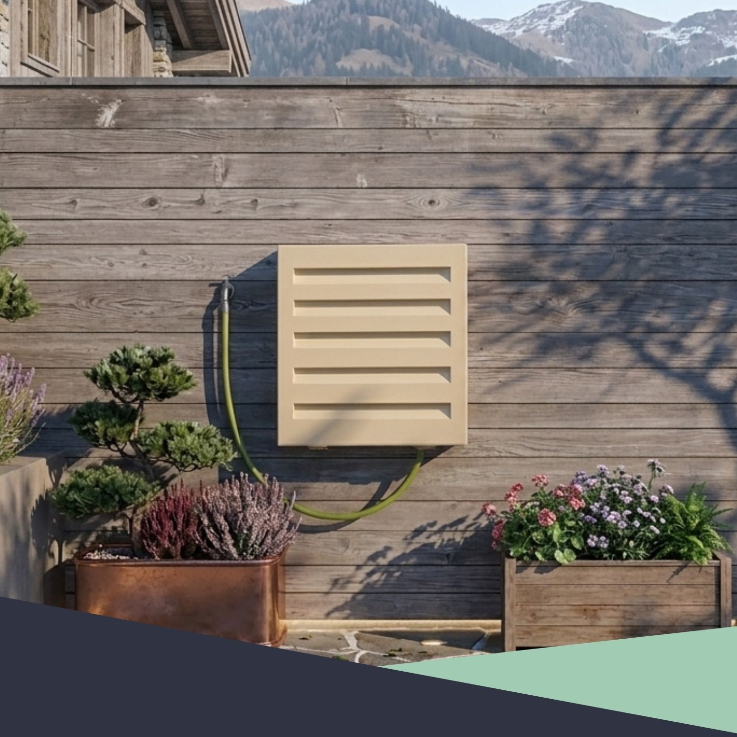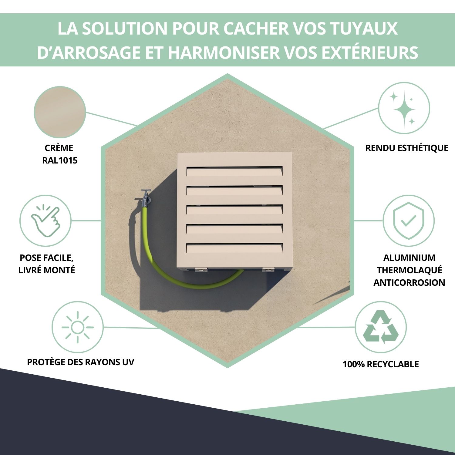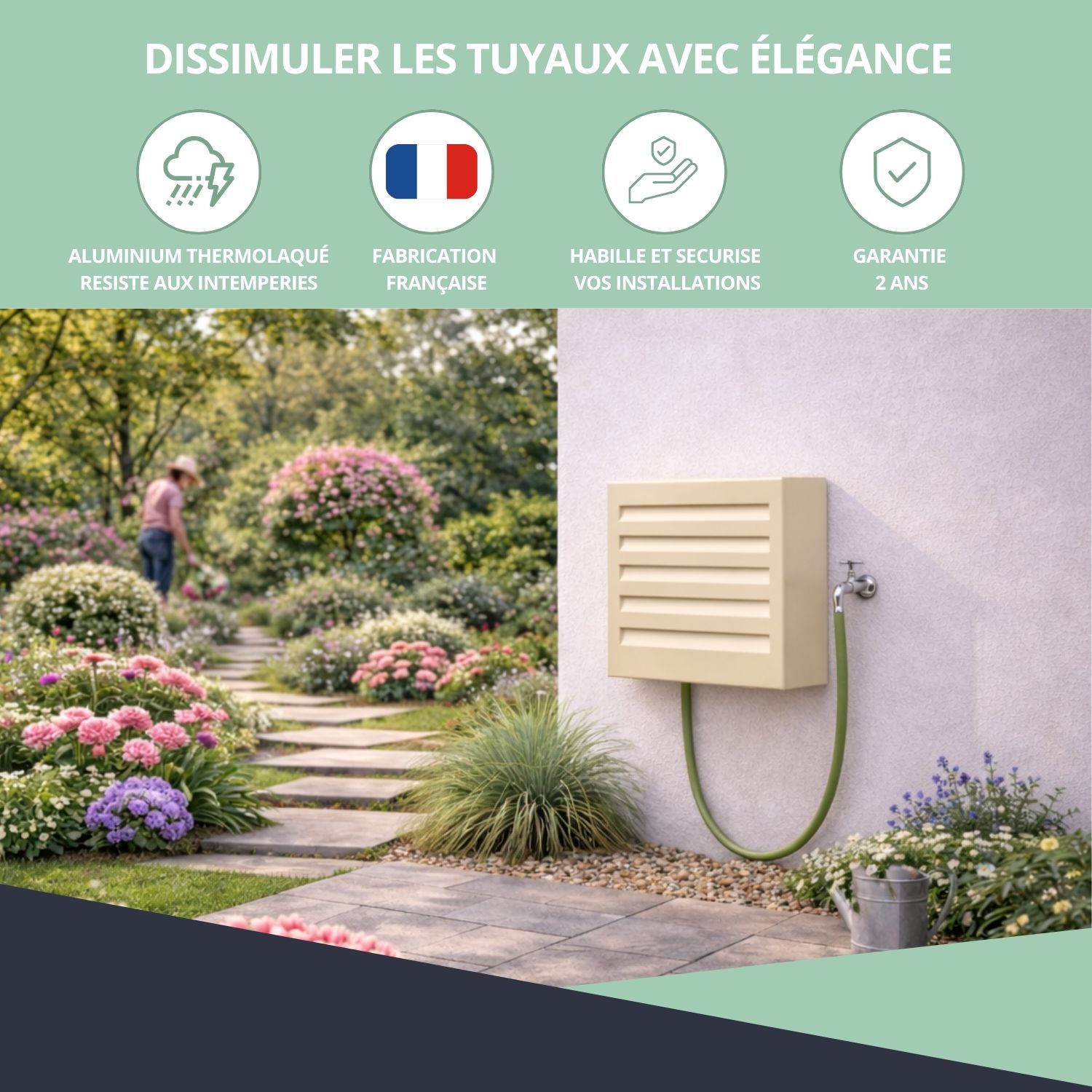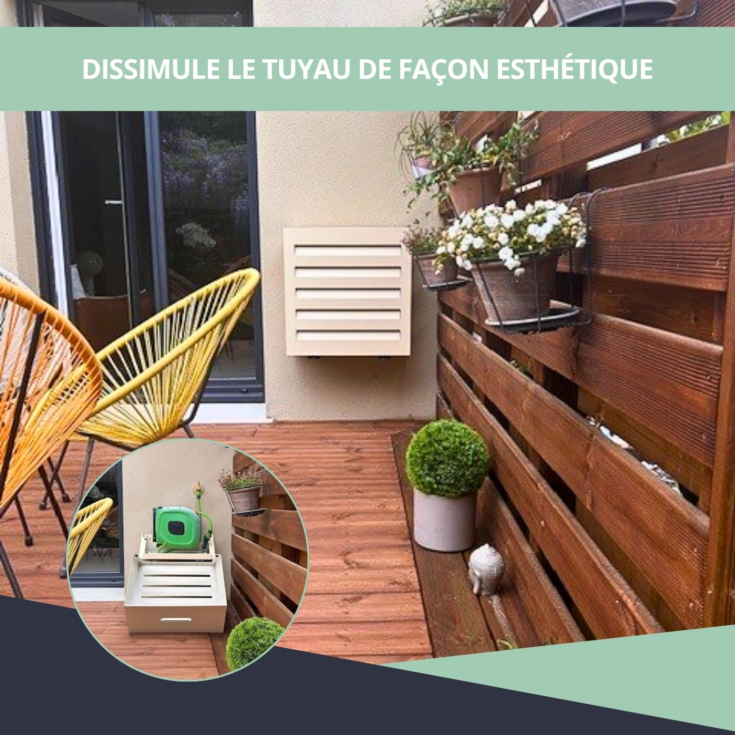 – Cache pour dévidoir mural permettant de dissimuler un tuyau d’arrosage extérieur