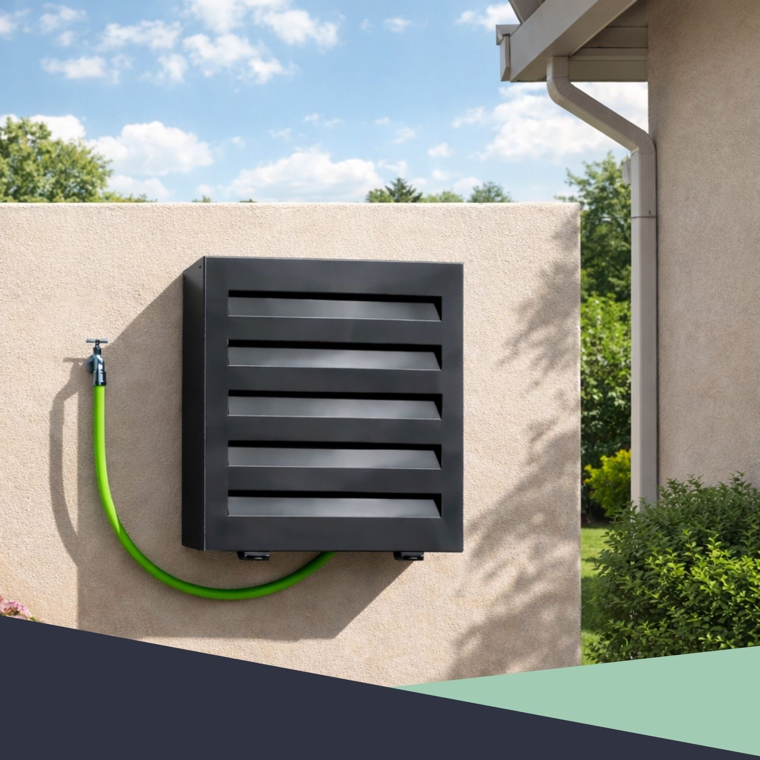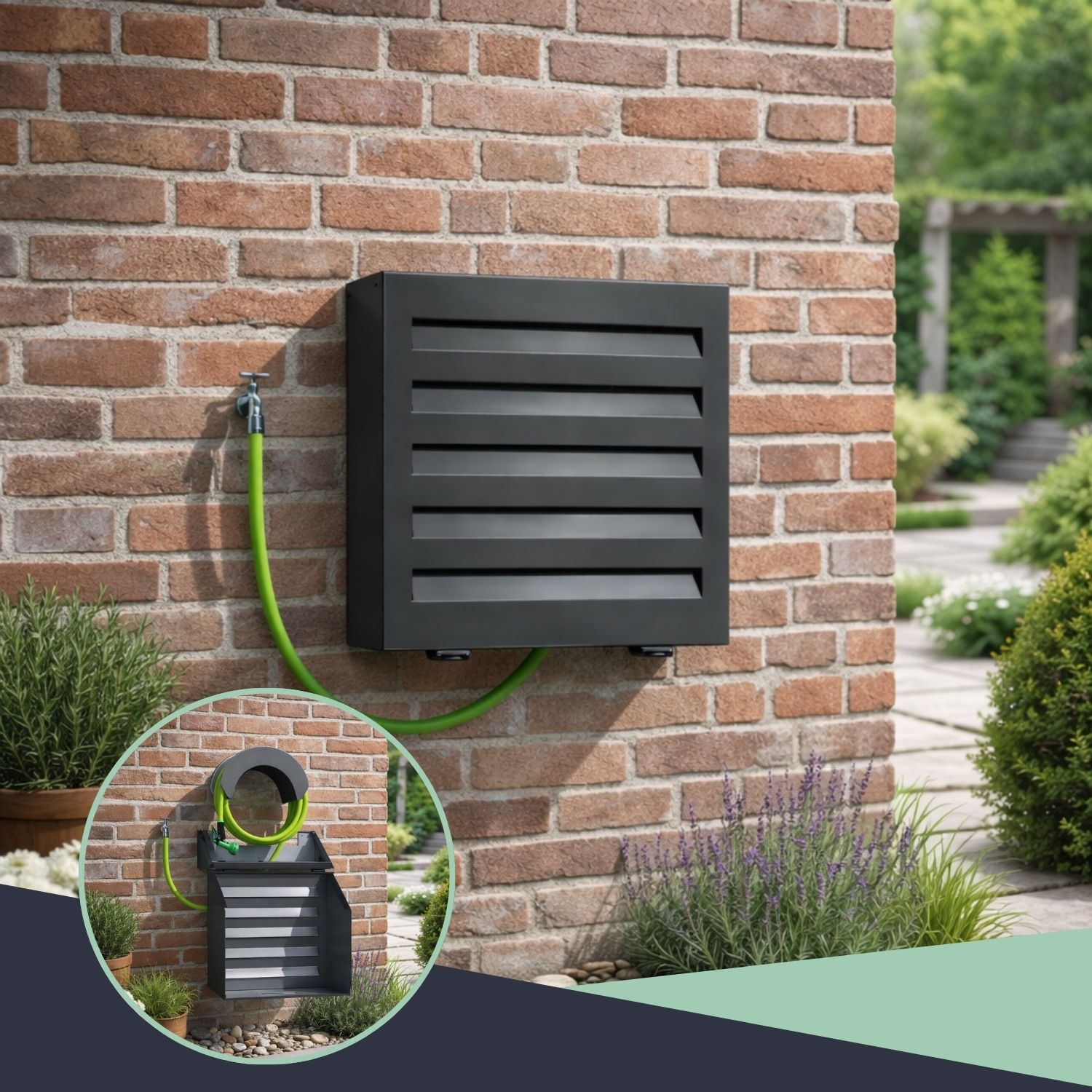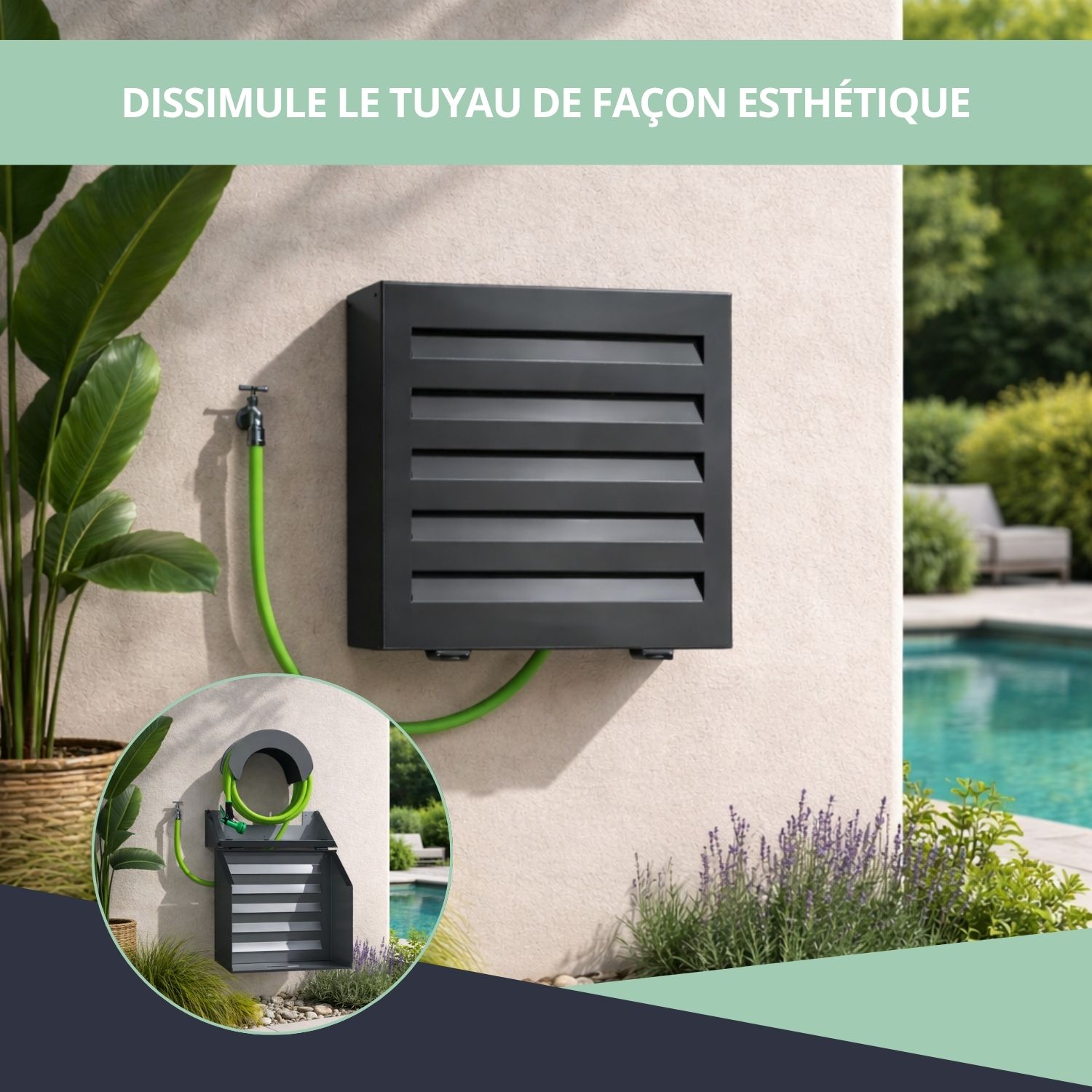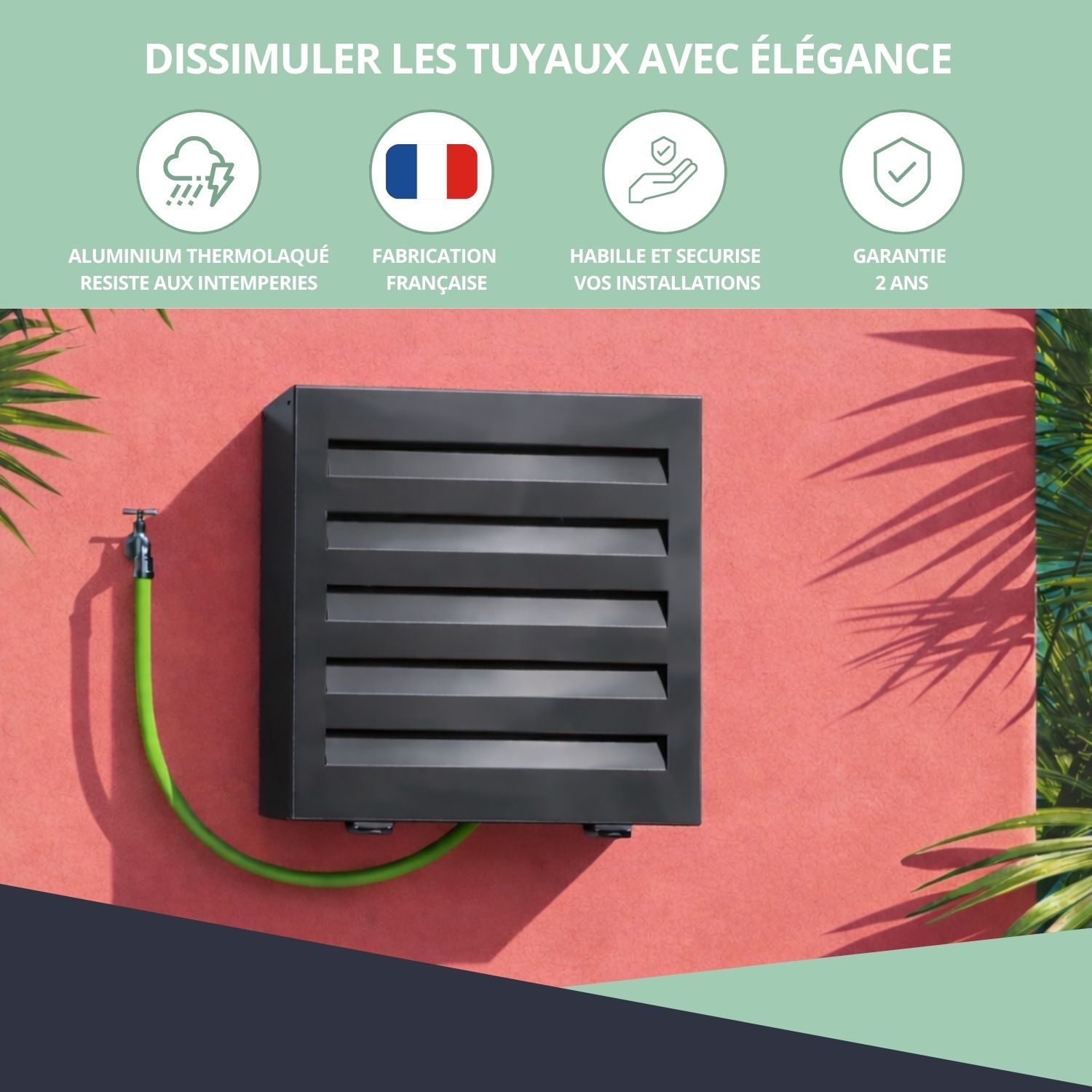 – Cache pour dévidoir mural permettant de dissimuler un tuyau d’arrosage extérieur