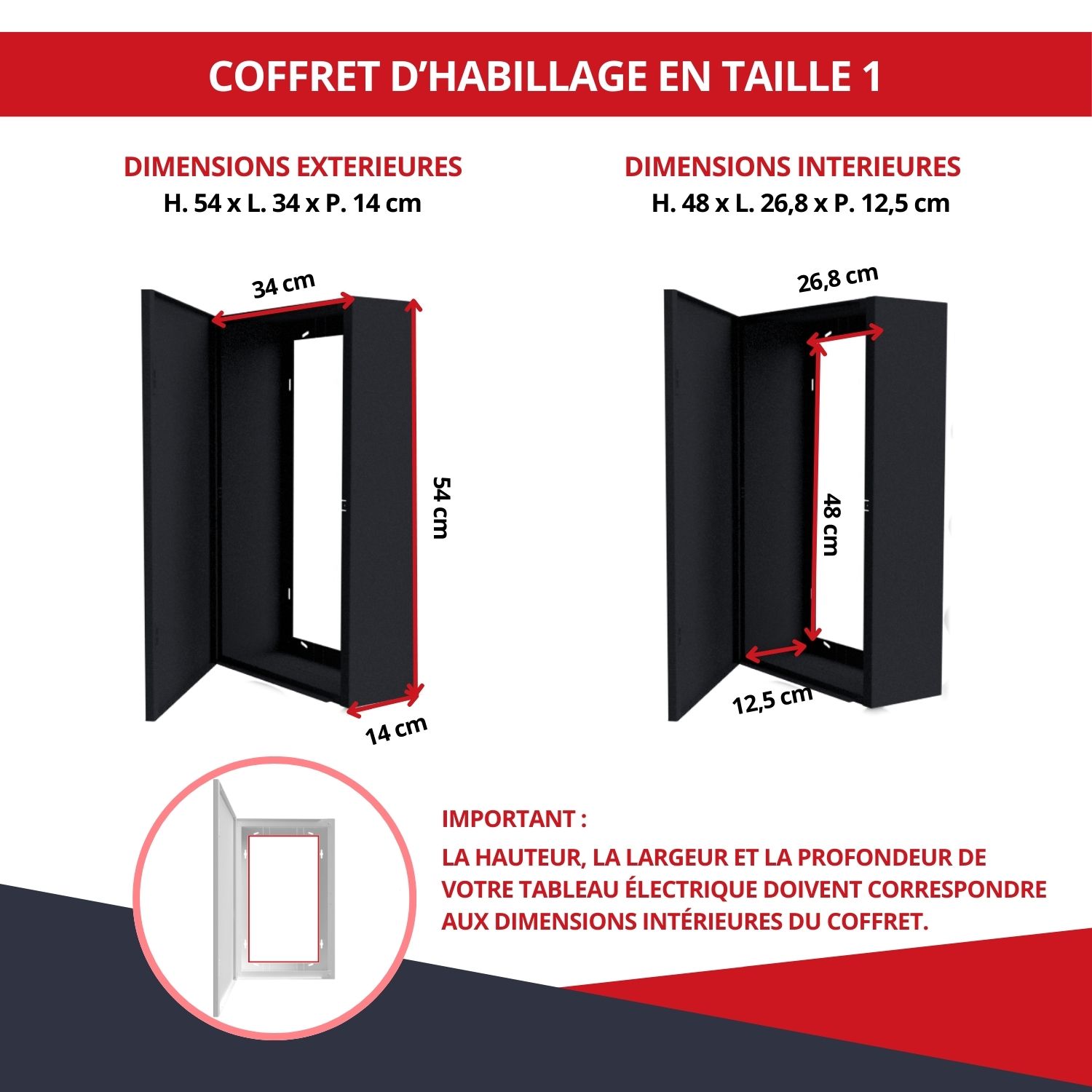 Coffret d’habillage tableau électrique acier thermolaqué noir mat – porte standard – 13 modules – cotes utiles 48 x 26,8 x 12,5 cm – Ref. RCH100NR